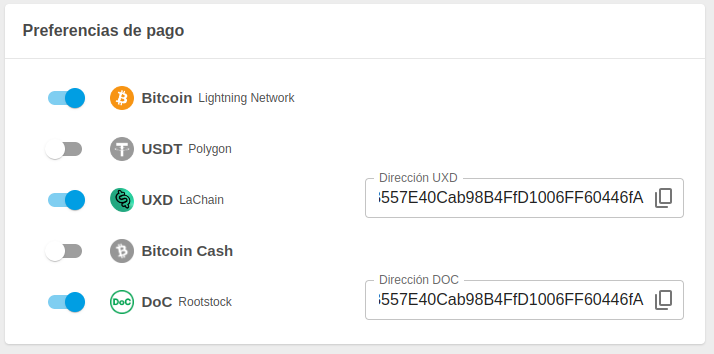 Payments in Bitcoin are made through the Lightning network using unique invoices for each transaction. The money that enters the Lightning channels is converted to USDC-Polygon, so the merchant must have an address available to receive this currency.
